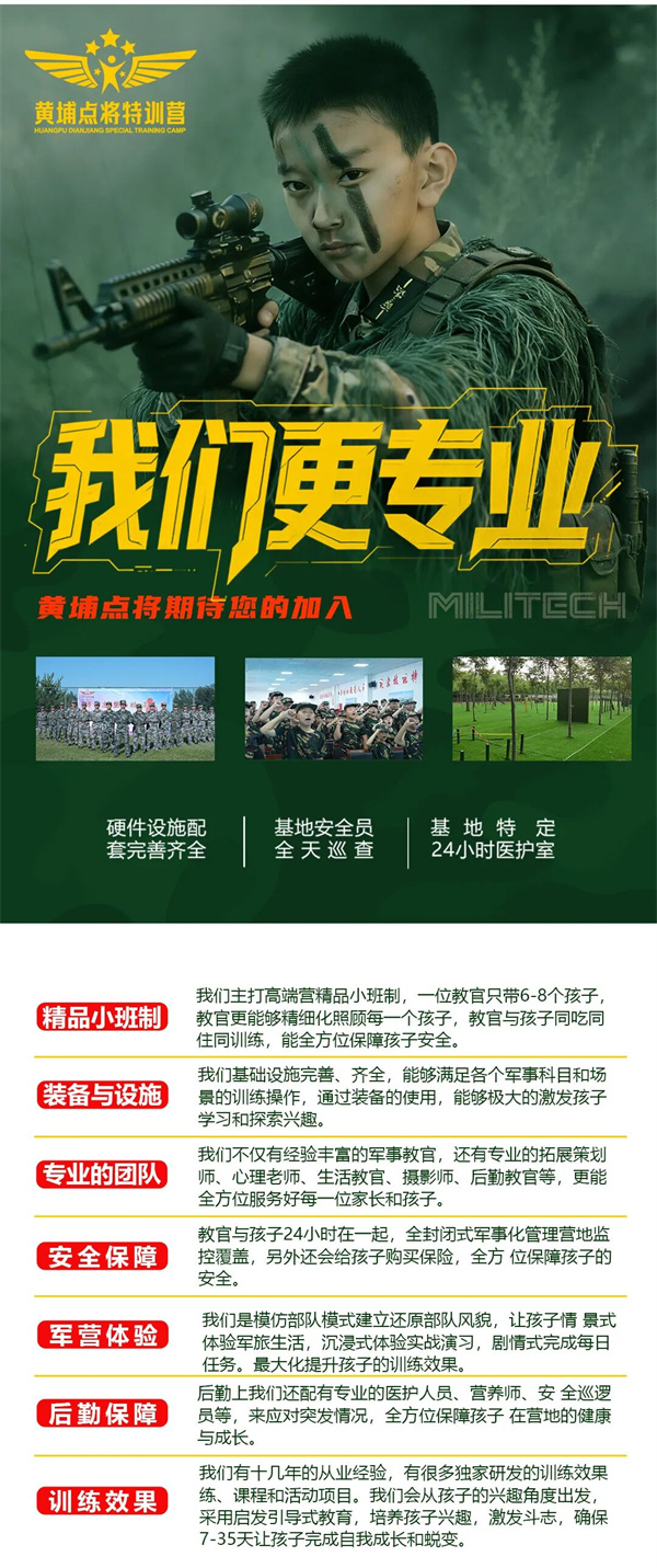 师资配比:教官1:6-8学员(24小时陪同,同吃同住同训练同学习同娱乐)