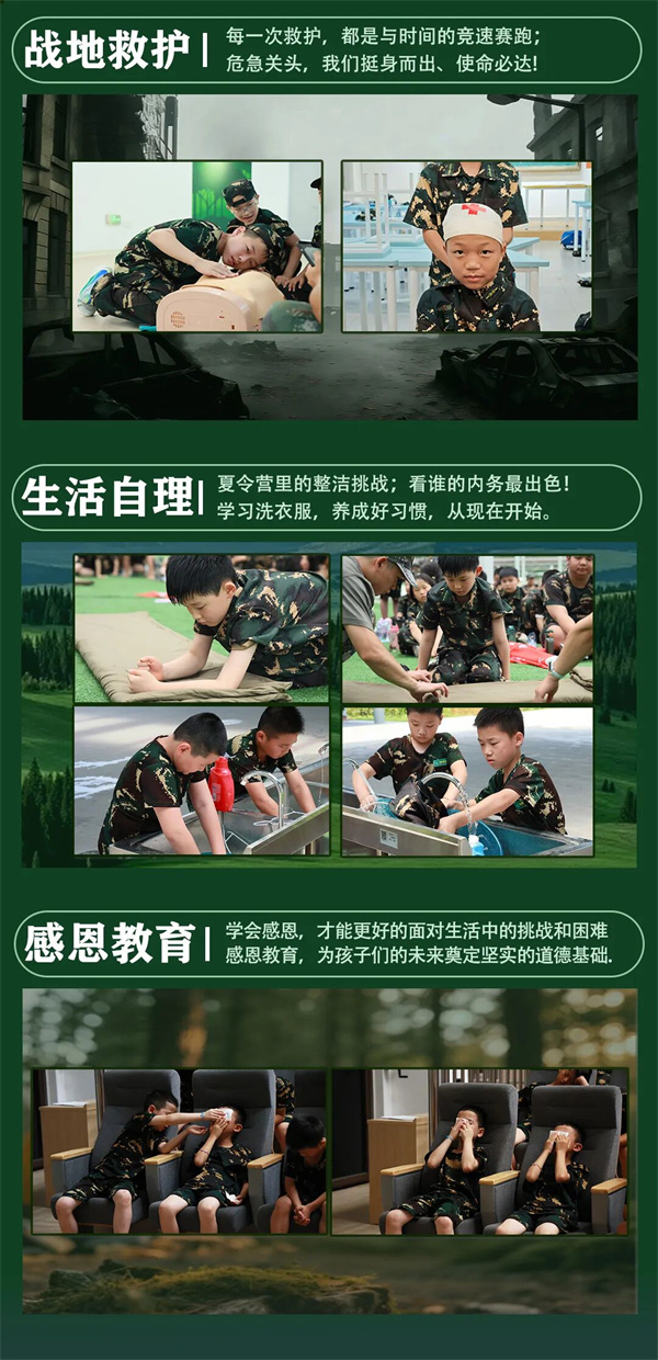 | D12 | 不倒森林:万亩森林拔地起,仅用一根手指支撑。团队较量,大比拼,看谁撑到最后; 盗梦空间:记忆力与逻辑双重考验,激发孩子潜能; 小兵大比拼:各营种学员展示军事技能,由营地领导做评委,选出优胜连队,激发学员斗志和国家荣誉感; 体能强化:意志与体能的双重考验,形体定型,勇攀高峰。 |