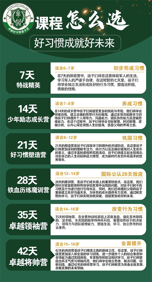 | D35 | 军事考核:巩固所学知识与所有技能,让孩子学有所成,给家长一份满意的答卷; 阅兵演练:学员方阵进行会操,激发学员斗志,团队荣誉感,让学员深深感到自己已经是一名战士; 闭营仪式:军事大阅兵、总结回顾、“优秀标兵”表彰、发放纪念品。 |
