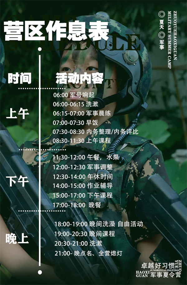 | 06:00军号响起 06:00—06:15洗漱 06:15—07:00军事晨练 07:00—07:30早餐 07:30—08: 30内务整理/内务评比 08:30—11:30上午课程 |