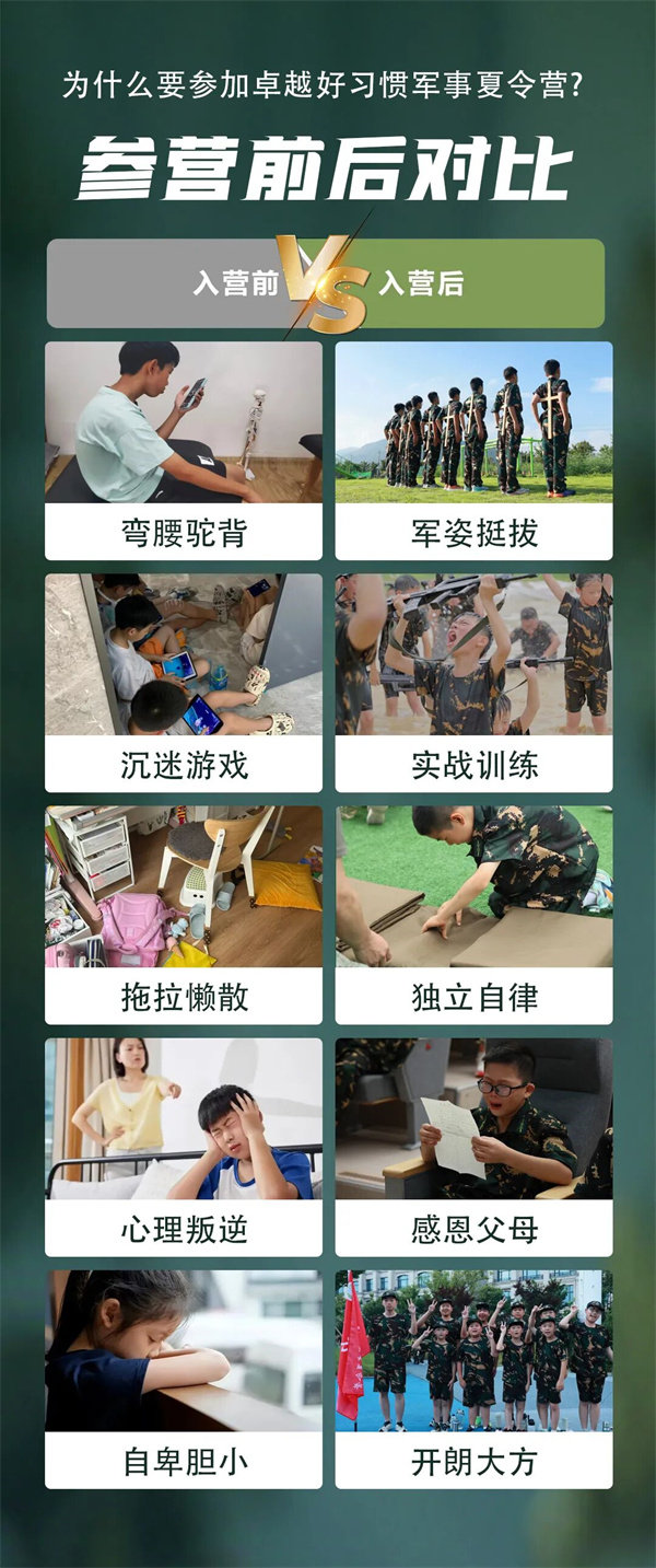 | D12 | 不倒森林:万亩森林拔地起,仅用一根手指支撑。团队较量,大比拼,看谁撑到最后; 盗梦空间:记忆力与逻辑双重考验,激发孩子潜能; 小兵大比拼:各营种学员展示军事技能,由营地领导做评委,选出优胜连队,激发学员斗志和国家荣誉感; 体能强化:意志与体能的双重考验,形体定型,勇攀高峰。 |