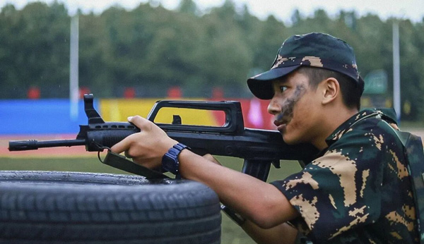 | 下午 | 军事装备体验:体验 03 式自动步枪 、95 式班用机枪 、92 式手枪等 现役枪械的分解与结合 ,触摸真实军事武器, 了解军事武器构造。 枪王挑战: 队员平举 95 式步枪 ,枪口用绳子吊着重物, 一动不动 坚持 30 分钟。 |