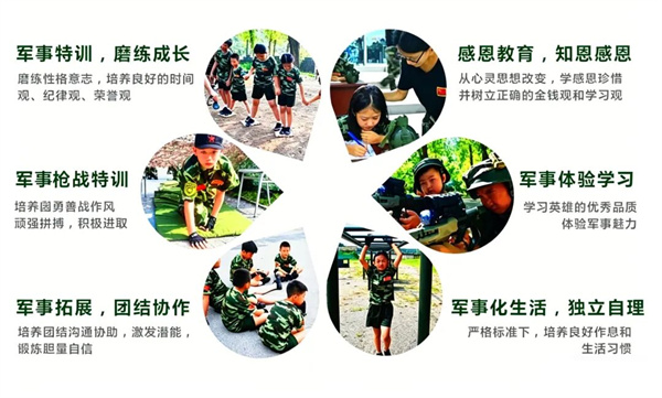 以军事拓展和教育体验为背景,进行军事野战情境模拟特训、两栖拓展项目、生存全能拓展、生活能力、灾难自救、生命意义、身体素质、感恩培训、兴趣爱好等融为一体。
